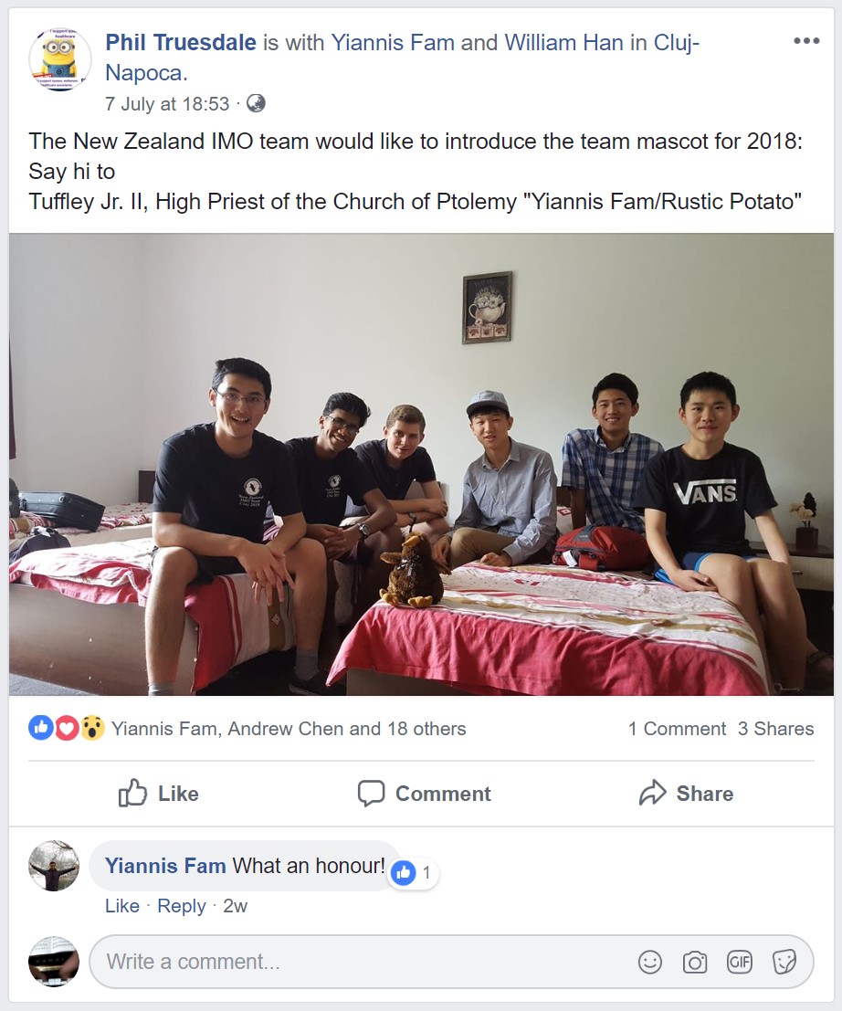 At some point Phil made a Facebook post about the kiwi, and so we were forced to come up with a name. Our final name? Tuffley Jr. II, High Priest of the Church of Ptolemy "Yiannis Fam/Rustic Potato"